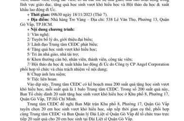 30 Tháng Mười Một, 2023Thông báo 7h30 sáng chủ nhật ngày 3/12/2023, Trung tâm CEDC phối hợp cùng Ban Quản lý Đài Liệt sĩ Quận Gò Vấp tổ chức dâng hương dâng hoa viếng các Anh hùng Liệt sĩ và trao 20 suất quà...