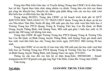 4 Tháng Chín, 2023Nhân dịp đầu năm học mới 2023-2024, Trung tâm CEDC phối hợp cùng Văn phòng thường trực Báo điện tử Đảng Cộng sản Việt Nam tại Đà Nẵng tổ chức trao 100 suất quà tặng học sinh vượt khó hiếu...